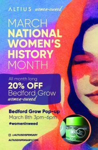 Celebrate National Women’s History Month all March long @ Altius. Altius is woman-owned and we’ve partnered with woman-owned Bedford Grow all month long. Enjoy 20% off Bedford Grow products all March.