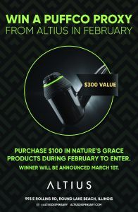 Purchase $100 in Nature’s Grace products during February for a chance to win a Puffco Proxy ($300 value) at Altius! Winner will be announced March 1st.